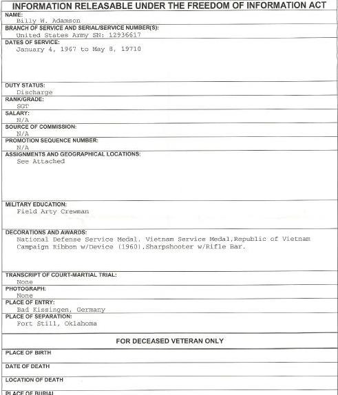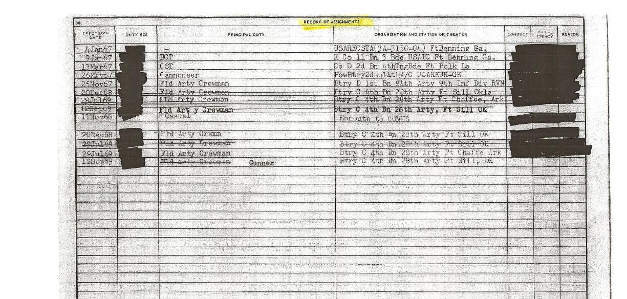 And there’s no mention of his Ranger School or Airborne School, or Camp Mackall. He did go to Vietnam for a year from Nov ’67- Nov ’68, but he was with an arty unit in the 9th Division and returned to serve at Fort Sill until his discharge in ’69. No assignment to MACV, though.