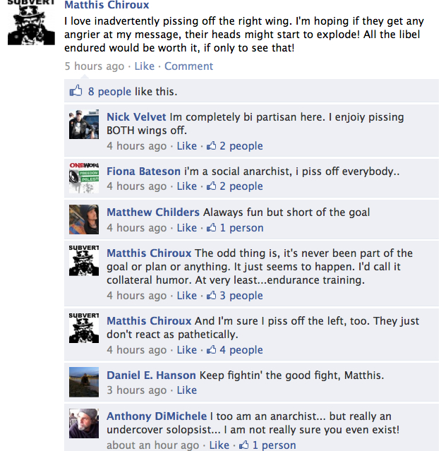 Oooooh NHSparky hit the nail right on the head! I think it is pretty obvious, looking at all the photos of Matthis, that he is on SOMETHING! He definitely looks like a methhead to me. And I must agree, all of the lies about Matthis are lies that he has spread himself. #1 would have to be calling himself an Afghanistan veteran when he knows he is NOT! And to any of you guys who haven’t had the “pleasure” of meeting him in person…..let me assure you, meeting him in person only makes your dislike for the guy grow 10-fold. The douchebag won’t even look you in the eye and have a mature discussion about his actions. He, instead, looks at the floor and wraps his arms around his legs. I saw it when he was confronted about the flag burning incident. He’s only strong when he has his anarchists standing behind him, patting his back, and screaming what to say in his ear.