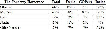 I guess McCain’s chore is to prove to Independents that he can do the job better than Barr – he’s never going to pry those Democrat votes away from Obama, so he needs those Barr insurgency votes.