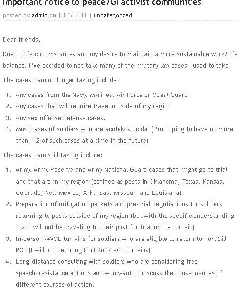 I regret having to do this, but after close to 5 years of incessant travel and stress, I’m feeling the need to make changes that will enable me to keep doing this work over the long haul. — If you are looking for legal counsel on a case I can’t take, please contact the Military Law Task Force (email: nlg.mltf@gmail.com, phone: (619)463-2369, web: www.nlgmltf.org) for assistance.