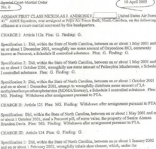 It looks like they dropped one charge of stealing percocet from his Air Force buddy, one charge of huffing shoe cleaner and one charge of selling meth.