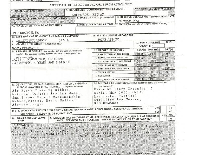 I doubt the validity of his DD214. In order to be a Load Master you need to spend time as a 2T2x1(my old career field), Air Transportation Specialist first so you know how to build up loads and tie things down so they don’t go careening around the air craft. There is no mention of him attending that school or holding that position.