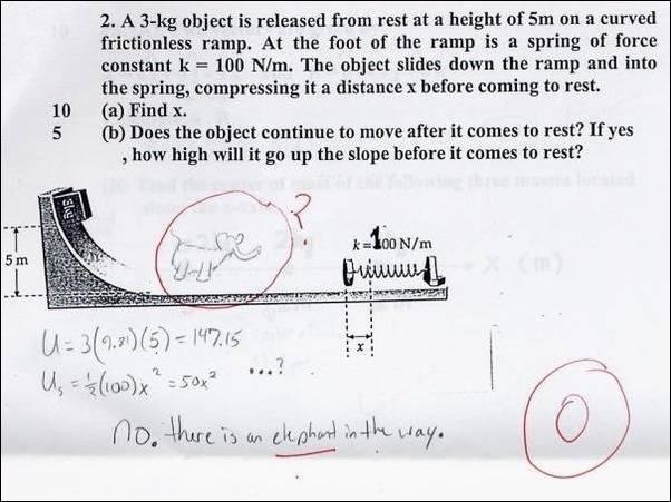 You can tell this picture is probably fake because the correct solution to the problem is already 80% on the page (as per comments 4 & 5). It’s hard to believe a competent grader would not give partial credit on a 10 point question for remembering U=mgh and U=0.5kx^2