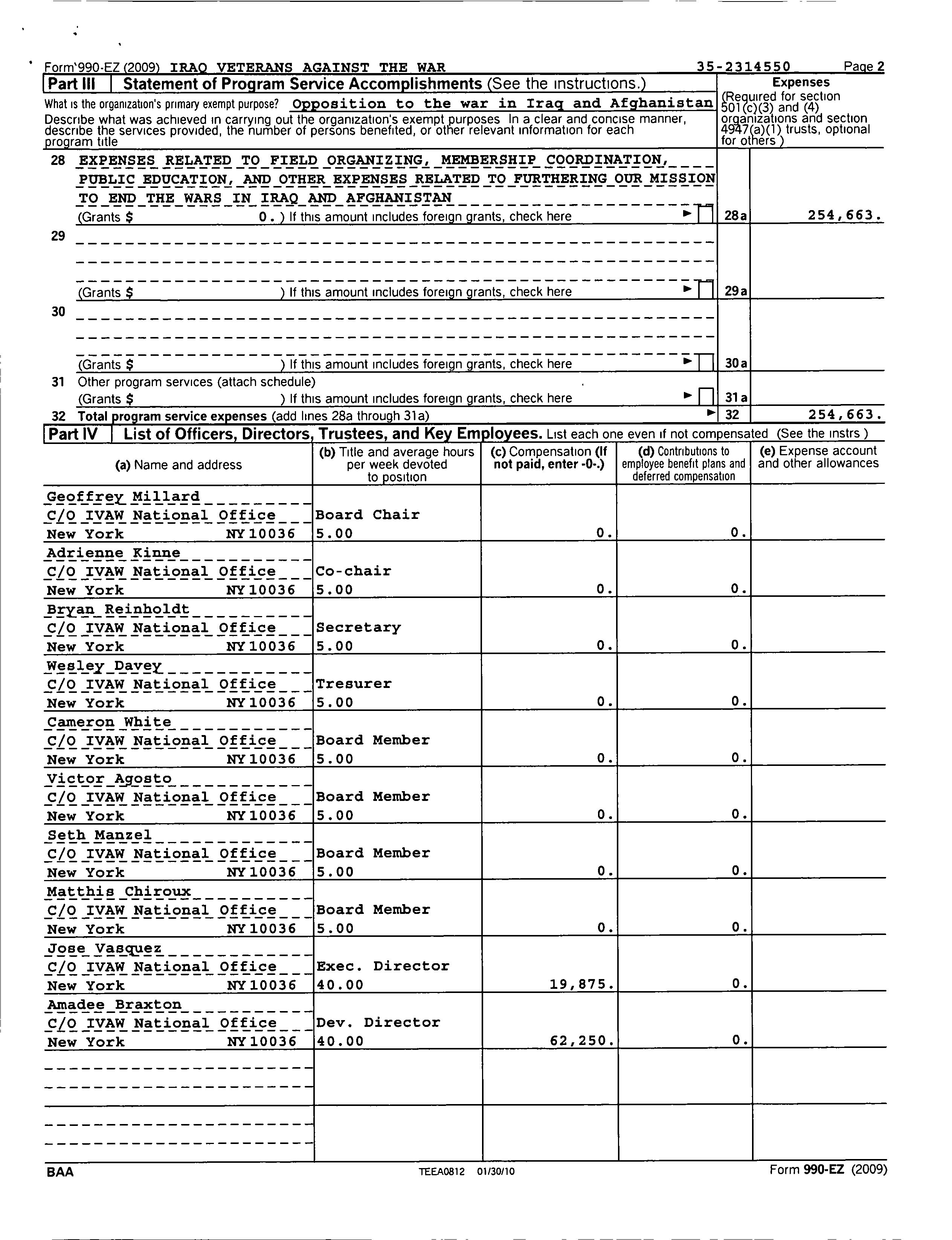 You might remember that with IAVA, the largest salary was the executive director’s salary. At IVAW, that’s not true. Jose Velasquez receives less than $20,000/year while Amadee Braxton, the only civilian on the board and the person who we think is responsible for the poor forgery of Jesse MacBeth’s DD214 gets the only livable wage of all members;