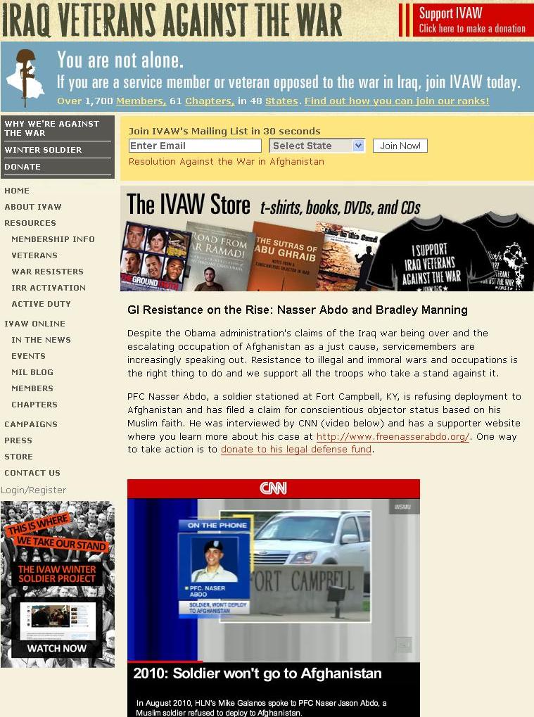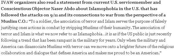 Added again: I just found this online about an anti-war press conference in NYC where IVAW members read a statement from Abdo on Islamophobia;