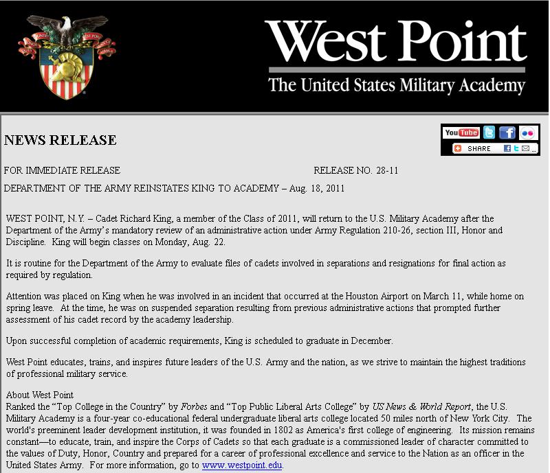 Cadet Richard King from the West Point class of 2011, but was suspended last Spring when he was beaten by Patti LaBelle’s body guards has been reinstated according to a press release from West Point;