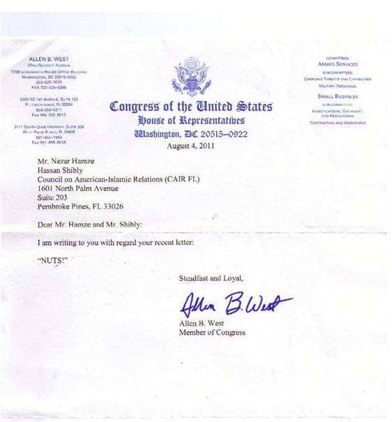Now, CAIR has received a letter from West with a one-word response to their request. In what the Miami New Times is calling possibly “dumbest thing ever written on congressional stationery,” West simply wrote back, “NUTS!” Here’s a copy of the letter: