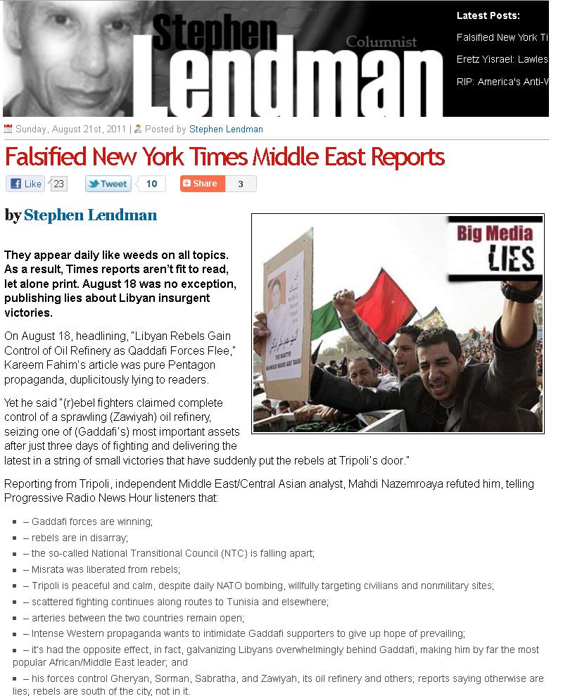 Although I agree with Mr. Lendeman’s sentiment that we should remain skeptical of the New York Times’ reportage, it’s kind of hard to imagine that every news service could be wrong. Especially since even other authors at Veterans Today are writing articles entitled “Libya After Gaddafi” and “Libya Falls“.