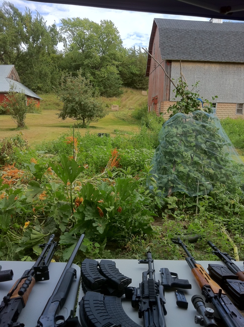 Defend; sorry to say, that’s not my farm, it belongs to a buddy of mine, that happens to love shooting, I live inside the metro area. We were down there shooting a couple of years ago and we had not quite as many bang toys as now, but someone commented that it makes us look like a bunch of hillbillies, so the name stuck and we decided to make his farm the official headquarters for the Hillbilly Hunt Club and that’s what it’s been ever since. We usually get there in the Spring and the Fall, because of all the greenery and the garden, but this year we added trap shooting to the mix, so we have been doing more shooting than normal (even though I can’t hit shit in the air, I give it the ‘ol college try and the other guys have fun giving me grief about it).