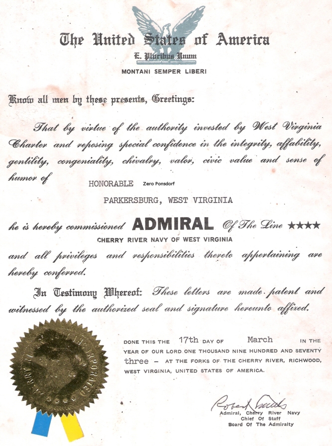 Zero, An Admiral in West Virginia? not to put too fine a point on it but isn’t that like being an emperor of an Oil Derick? Or being the mayor of a town with one person?