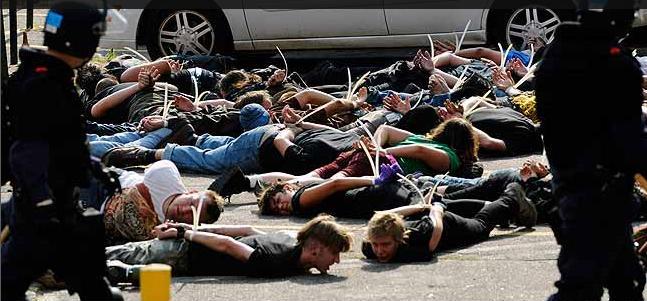 My inbox is filling up with pictures and articles from yesterday’s protests. Isn’t that a sweet-ass picture above? Nothing like a bunch of tiny-brained imbeciles laying face down on the pavement in flex cuffs to start your day, is there?