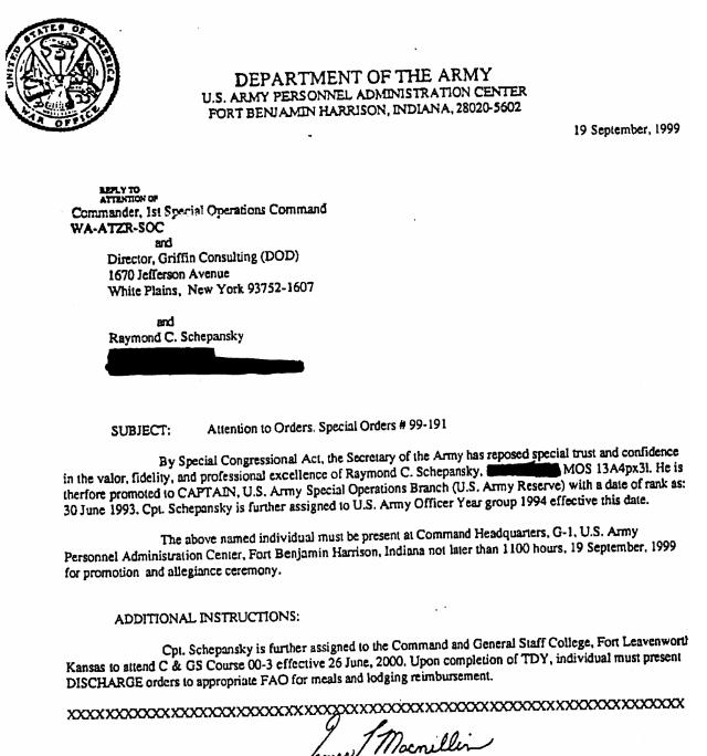 Re “Commissioning Memo” – it is obviously a fake. Just on first glance, here are the problems that I see: all above “Subject” is not correctly formatted; “Attention to Orders” would not be on the subject line; spacing after “subject” incorrect, memo paragraphs are bullets with 1., 2., etc., not indented; date line would not have a comma after the month; officer MOSs (13A4px31 in this case) do not include anything beyond the branch code (13A), because all after identify enlisted skill levels and ASIs; 13A is a field artillery officer, not an SF officer (18A); if he were commissioned effective 30 Jun 1993, he would be YG 93, not 94; no one would ever put the phrase “Command Headquarters, G-1? in anything; report times and dates are in orders, not memos, he would have to have orders to report for pay purposes; there is no such thing as an “allegiance ceremony”; there is nothing called “special instructions” in a memo; orders to a school are in orders, not memos; the Command and General Staff College is CGSC, not C & GS; majors attend CGSC, captains attended CAS3; given the TDY and not PCS “order” the assumption is that the “C&GC Course 00-3? refers to the RC summer course which required a year of classroom study before attending the two week summer phase that could not have been completed given the time line; an officer would not get “DISCHARGE orders” after completing a 2 week school; TDY reimbursement requires travel orders, not discharge orders; the “xxxx” line is not part of the memorandum format; and the signature block should be “LTC, AG” without the spaces between.