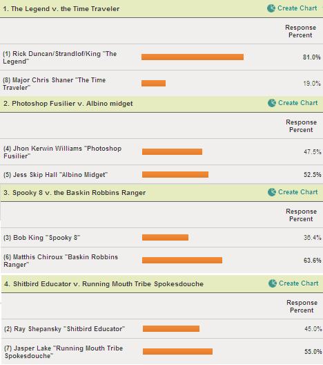 Writing these things up takes a ton of time, so I am glad the races are close. I admit, I kinda was pulling for Jasper Lake after reading more about him. Dude is wack.