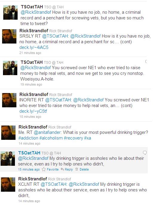 Then I find this assholes Twitter page. Bear in mind that this is a homeless grifter who screwed over every one of our brothers and sisters in arms who actually *were* wounded, and then explain to me why this rectal emission has the capability to Tweet every 3 minutes. I sincerely hope that every one of his followers is some asshole like me only watching it waiting for him to inevitably embrace a new identity and screw over a new group.