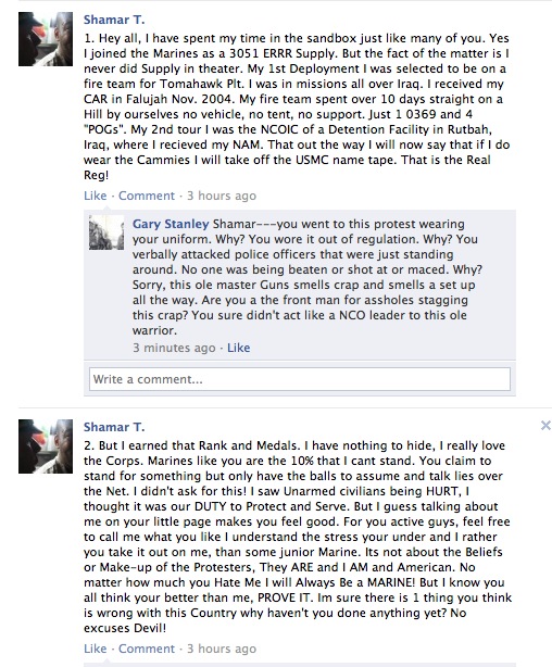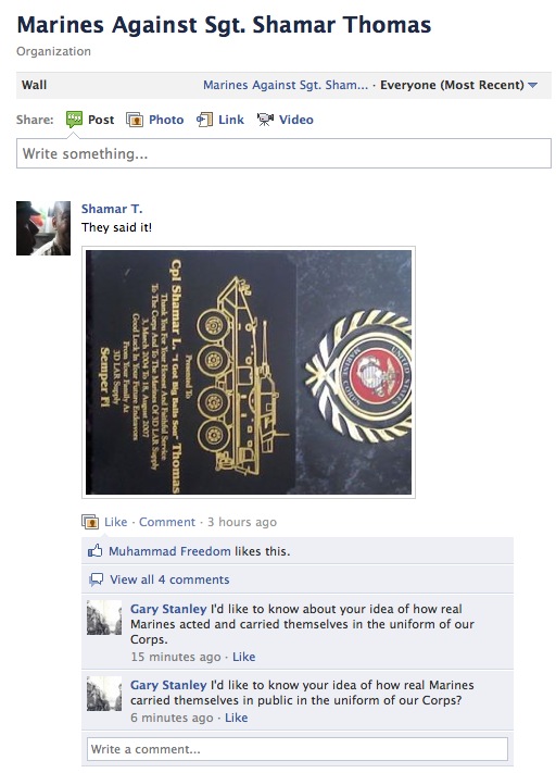 I know Sporkmaster has written a few times about Shamar Thomas, the huge clown who thought it was appropriate to pin his ribbons on his utility uniform and yell at police. Apparently, some other Marines have taken exception with his behavior and formed a Facebook group called Marines Against Shamar Thomas…and he’s not happy about it. Paul sends us these screen shots;