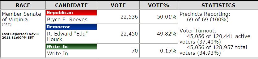 One congratulation is in order, in Virginia’s 13th district, which is Loudon and Prince William County, Dick Black was elected to the Senate. I used to attend Senator Black’s functions back when he was a delegate. But, the reason I know him is because when I came home from Bosnia he was there when I got a state medal that had a big sticker on it that read “Made in China”. Needless to say, I was displeased with that. Anyway, then-Delegate Black authored a bill to ensure that all future medals given by the Commonwealth would be American Made. That bill passed.