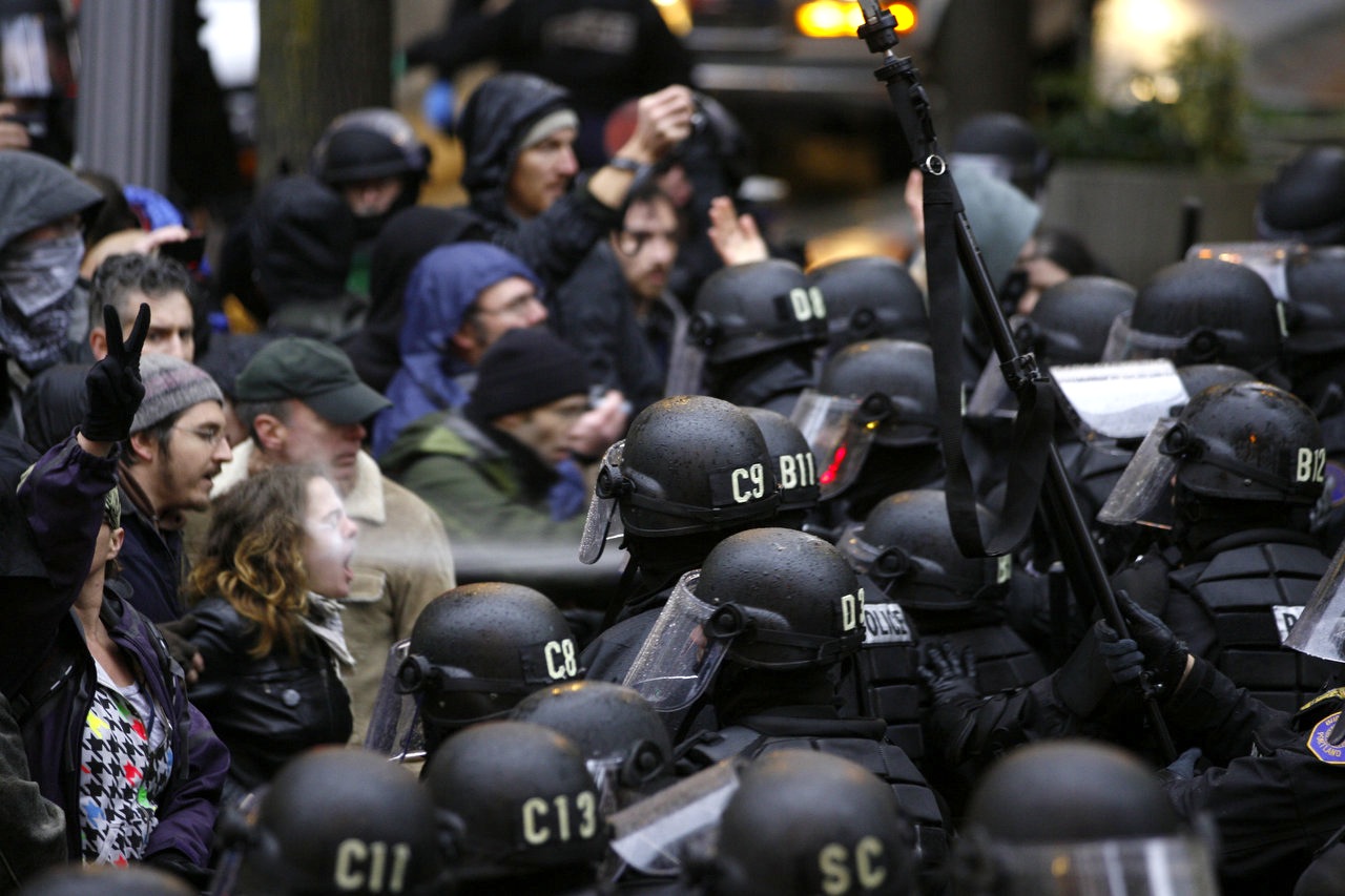 Moneyshot happens around 1:30; just as she starts yelling something at them, she gets hooked up. The cops were more than patient with that crowd, especially after one of those guys punched a mounted officer’s horse in the face.