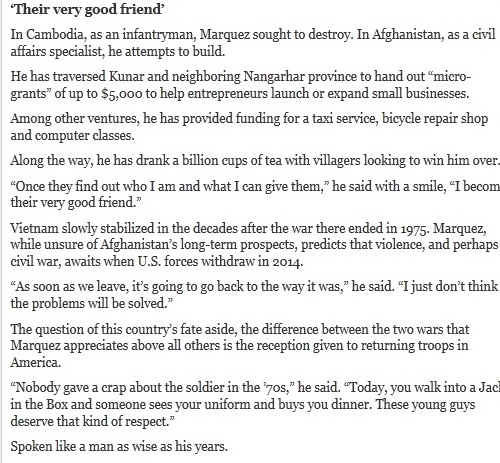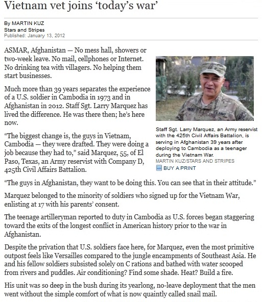 Kevin sent us a link to a Stars & Stripes article about a Vietnam veteran serving in Afghanistan, the title was “Vietnam vet joins ‘today’s war’” and it tells the story of Staff Sergeant Larry Marquez who says he was sent to Cambodia in 1973 as a raw recruit of 17 years. He compares the environment in Cambodia to Afghanistan and difference between serving in a war now to the war he saw.