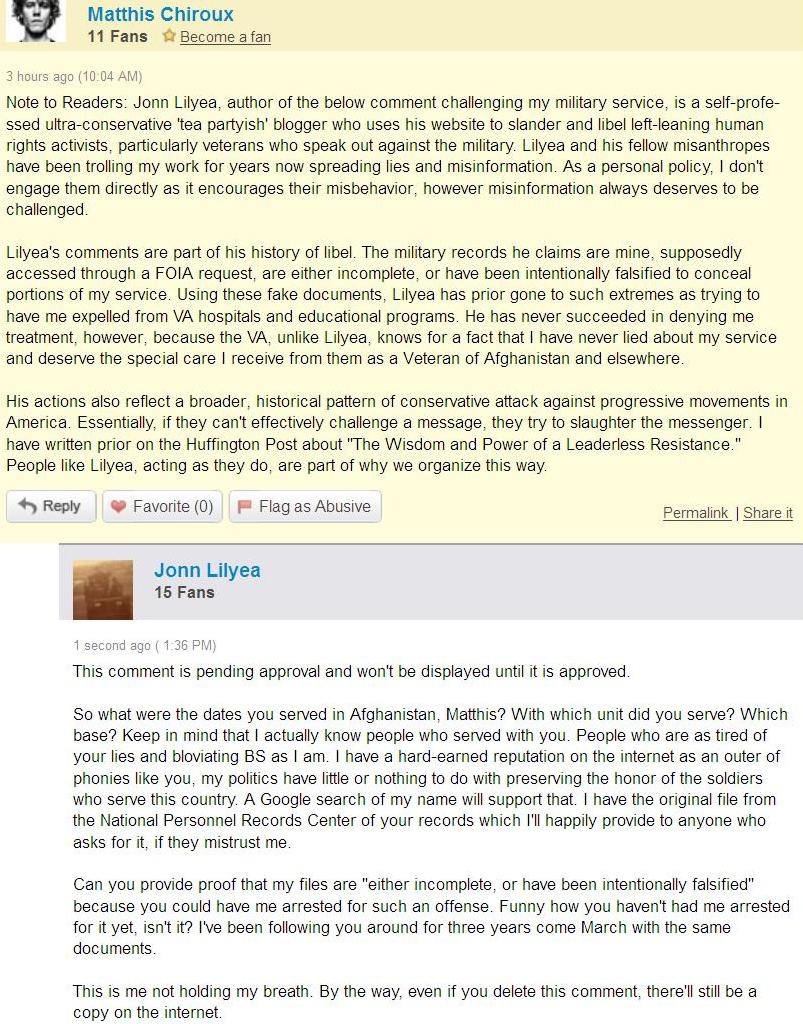 JAGC dropped off a comment in the previous Matthis post that I should go back and check the HuffPo article, so, cuz I always do what you guys tell me to do, I did, and lo and behold, I got the personal treatment from Matthis hisseff’;