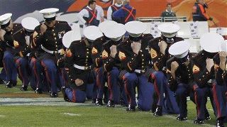 Marines perform their version of ‘Tebowing’ before the Broncos-Jets game on Nov. 17. (AP Photo/Barry Gutierrez)