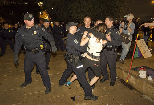 Funny, but of all of the pictures I’ve seen from OWS protesters confronting the police, crapping on police cars, crapping on sidewalks, throwing bricks at cops, defacing public and private property, none of them have been dressed in black. Like the picture above of Austin police trying to apprehend a female protester when they tossed out Occupy protesters in the Texas capital. Look at the people who are getting in the faces of police in the video of the cleanup in McPherson Square in DC this weekend. How many of them are wearing the black uniform of the Black Bloc?