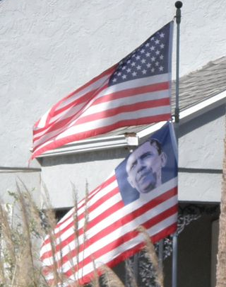 A link sent to us by ROS from the Sunshine State describes the scene outside of the Lake County, FL Democrat Party offices yesterday when veterans demanded that they remove the flag which had replaced the blue field and stars with an image of the President that was flying below the unaltered flag. The veterans offered a POW/MIA flag to replace the defaced flag;