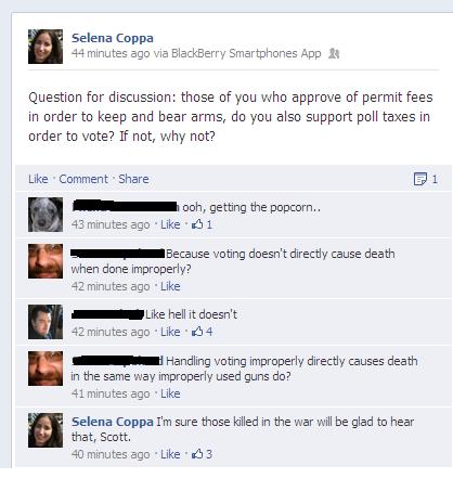 Anyway, to her larger point, I think it is a good one. Obviously a ton of folks think fees and registration for guns is perfectly valid. And her question notes correctly that none of the folks thinking that would agree to a poll tax. In fact, I bet if you took only folks who supported gun control and asked how many thought it was appropriate to pass a law requiring IDs at polling places, it would be heavily skewed.