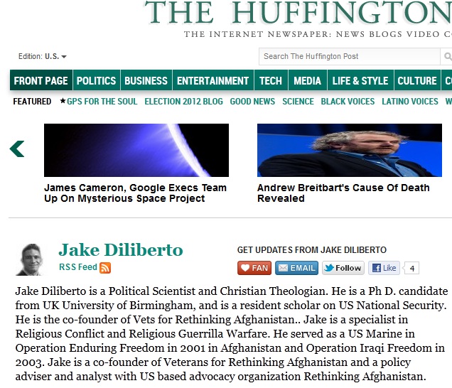EDITOR’S NOTE: Since I first took the above screen shot of Diliberto’s bio on HuffPo, he’s changed it to read that he served in “Af/Pak” in 2001 because I told him that I was publishing this and sent him a copy of the draft of this post.