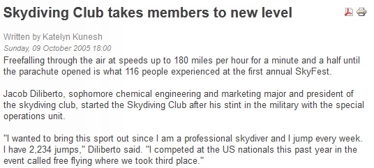 0311: There’s no thumbnail on the first link matching the photo in your second link. But his claim does seem accurate. This link may be a bit clearer, and also verifies Diliberto’s skydiving claim.