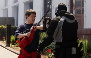 Here’s the mentally handicapped Marxist facing down a vigilante dressed as a super hero. If that doesn’t just sum up how screwed we all are I don’t know what does. Credit to the Seattle Times.