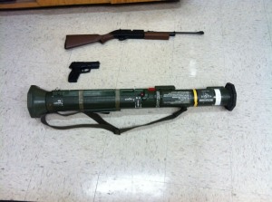 Three weapons were recovered, including an inert M136 AT4 “LAW” anti-tank weapon, a b.b. gun rifle and a replica 9mm hand gun, police said.