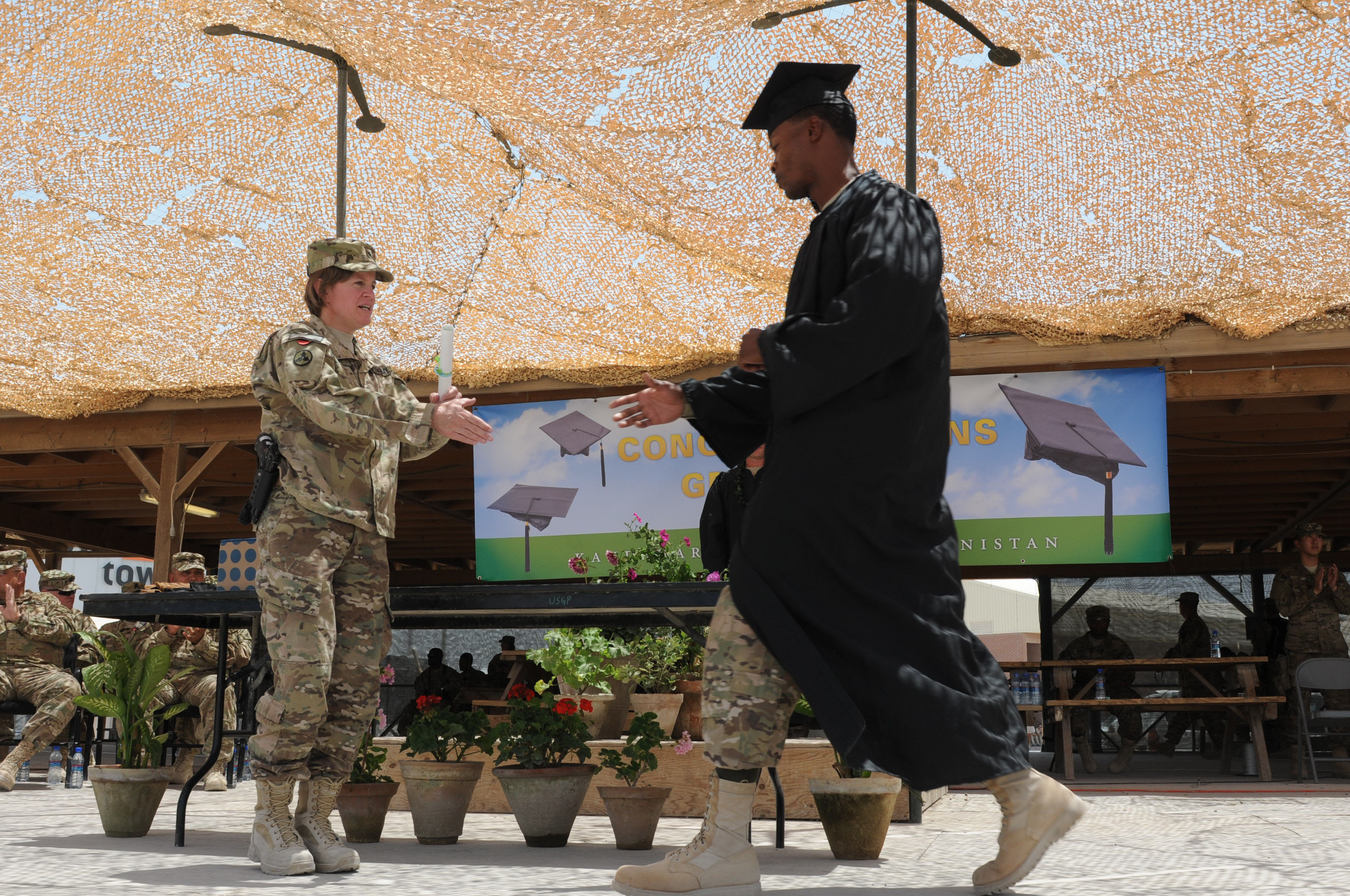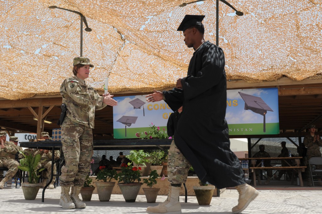 Thirty Soldiers participated in the first-ever Kandahar Airfield college graduation ceremony on May 23 in Kandahar, Afghanistan.