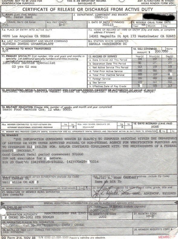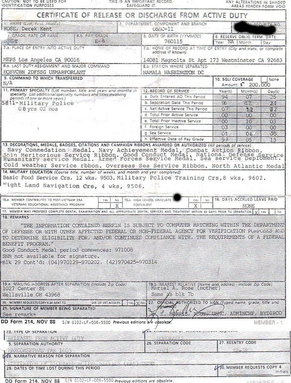 Mary at POW Network sends us their research on Derek Kent Rose who was arrested in Virginia last week for receiving stolen property and not registering with the sex offender registry. Apparently, he was also caught forging his DD214 a while back and using the Wounded Warrior program telling the tale that he was in a HMMV accident which killed four of his fellow Marines and he caught a TBI while they died in his arms. Here’s the DD214 he began to alter with an X-acto knife;