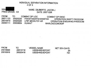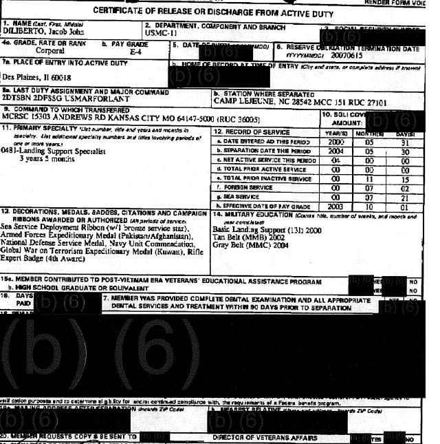 Hondo went ahead and got a FOIA on Jake Diliberto, the guy we profiled the other day who goes on Larry King and Russia TV, and writes for the Huffington Post under a bio which claims he’s an Afghanistan and Iraq veteran. As we mentioned the other day with the colorful narratives from his fellow Marines, Diliberto has been to neither Afghanistan nor Iraq. Here’s his DD214;