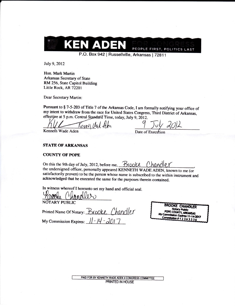 Ken Aden, Democratic Candidate for U.S. Congress from Arkansas’ Third Congressional District, on Monday morning announced his intent to withdraw from the race for United States Congress effective at 5 p.m. on Monday, July 9, 2012.