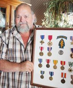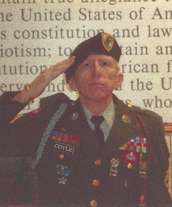 WITTGENFELD: He’s a bona-fide true action war hero of Vietnam, and if you doubt it, just ask him about any subject including the current price for oolong tea in Tibet and I guarantee the answer includes how he was a LRRP in Vietnam. But, as with all great and true trail assassins, Wittgenfeld got south on an international cabal of reporters and valor vultures who ripped through the time/space continuum and went back in time to add that he was a green beret and Bronze Star with “V’ Device recipient to 8 of his media interviews. Also, they somehow force him to wear the green beret, to threaten Ms Mary from POWNet, and to use racial slurs while threatening people. But no, really, he’s a delightful man who would never steal valor and misread the Constitution.COYLE: I ask again, who among us hasn’t on occasion gone AWOL from New Jersey? It is New Jersey folks. CIB and Purple Heart: Jersey. The goofy look and oversized name tag though, that has to be from the Magic Kingdom. (Or Kingdumb in his case.) The Ranger Tab he got from a trip over to watch Temple play baskbetball in Philly, and having been there as well, he earned that one. (“Turn left at the second burning car.”)