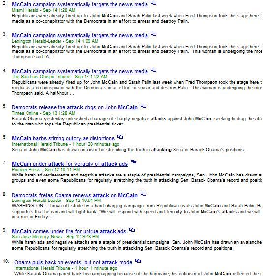 Now a search of “McCain+attack” results in 11,000 hits, too (the first three articles were the same, so I cut one out)