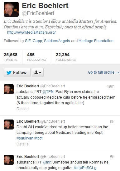 For those of you who missed Sparky’s link in the comments, here’s the Twitter shot of Eric Boehlert’s remark about the folks of Special Operations OPSEC Education Fund’s video they sent us yesterday;