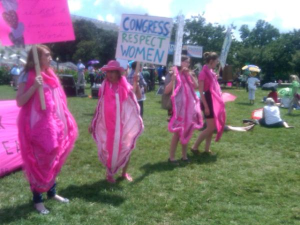 “Congress, we demand you respect women!” say the people dressed up as genitalia.