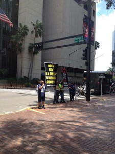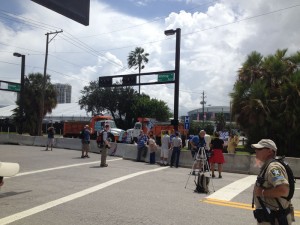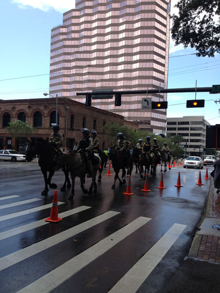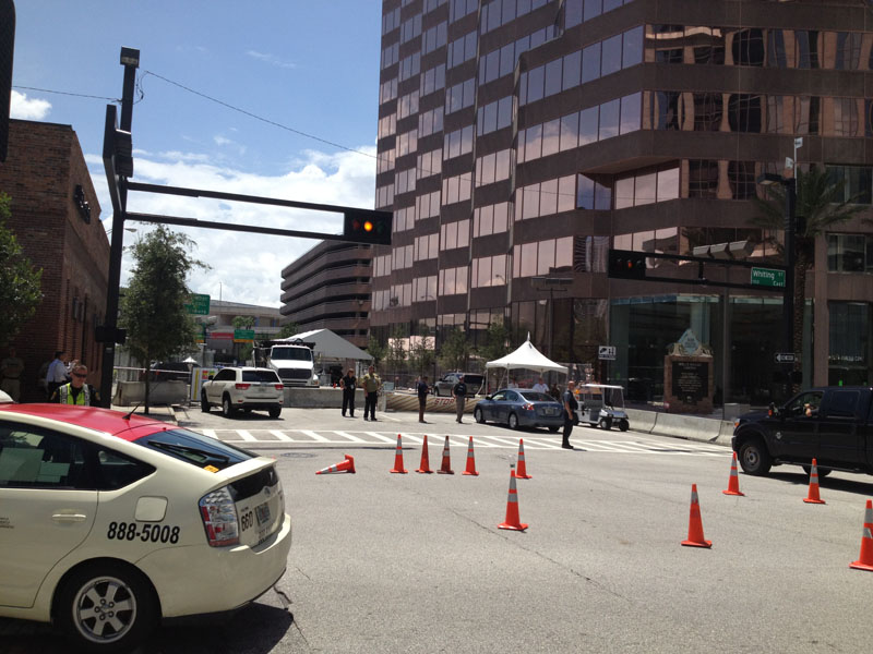 There are small pockets here and there but nothing coordinated or even mildly exciting. The scene in downtown Tampa is mainly one of police officers just standing around in large groups talking.