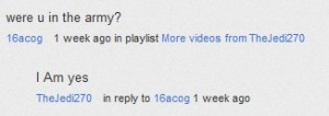 You gentlemen let one slip by on you a few dozen posts back. The M-16 poster stated he was 14 years old, and when he is 17 he plans to enlist. Later on he claims to have completed BRM and Boot camp as a member of the super wonder friends or some such thing as he begins the contrite tongue dragging across his i-pad, i-phone whatever technique he has been using to bang out the semi-coherent robotussen fueled nonsensical ramblings of wanting to be an EOD training tool. How is it that 14 year olds are doing BRM and Boot? I can imagine a boy scout or junior G-man camp where guys describe what the insides of their sister feel like while they dare each other to take an airsoft round to the twig-n-berries, but I don’t think they would confuse it for Army training. Sure a weekend of watching Stripes and Hamburger Hill may be traumatic, but it is not exactly PTSD inducing, or is it? And this young man is probably a Jedi supporter because the guy prestiged on Call of Duty a few times. Hey kiddo, holding the L1 trigger and pressing the A button repeatedly doesn’t make you a sniper. Ask someone who knows, and no. your hashtaggedfag buddy isn’t a knowledgeable source of information.