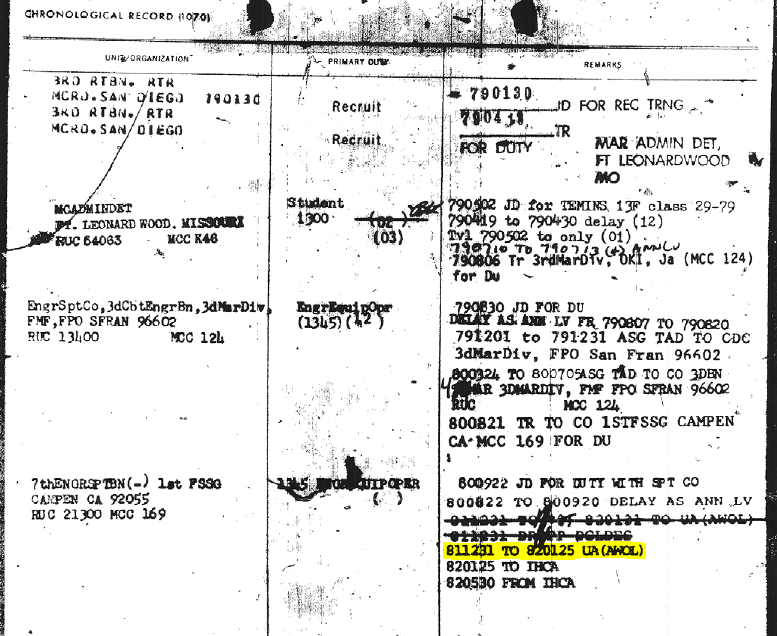 And, his assignments. Notice the little AWOL remark that’s highlighted near the bottom;