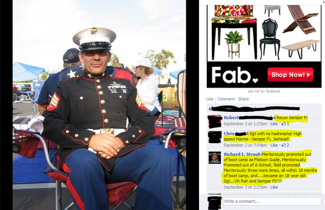 Scotty sends us a link to his research on Richard E. Straub who claimed to be a member of the Marine Recon team, and since we haven’t had a Marine phony in a while, I figured we’d include him this week. He claimed that he made Sergeant E-5 while he was 18 years old. Totally plausible;