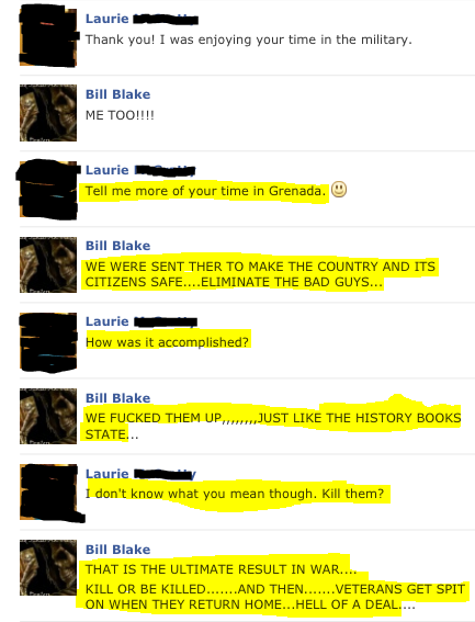 26. The known VBA thief Bill Blake continues to send his text messages in lieu of responding to the allegations that he is a perpetrator of stolen valor and his questionable combat Marine claims.