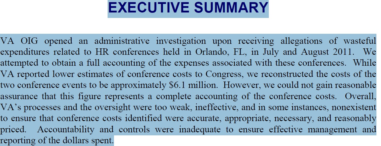 ADDED: TSO send this screen shot of the opening sentences of the Office of the Inspector General Report on their investigation into this most egregious waste of taxpayers’ money – especially money that was supposed to benefit veterans’;