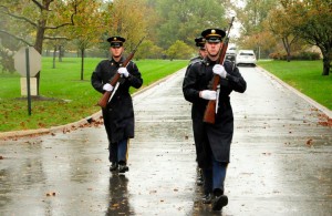 Everyone, including us, made a big deal about the sentinel at the Tomb of the Unknown Soldiers yesterday as they walked their post in the face of the hurricane “Sandy” while most of the nation’s capitol cowered in their homes. The ingrates at the Democratic Underground criticized them and the reason they walk that post. Well the “Old Guard”, the 3rd Infantry Regiment at Fort Meyers, VA wasn’t just guarding the Tombs yesterday. This is a picture of a firing detail at Arlington as they return from a funeral yesterday;