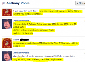 So, there’s this guy that’s been hanging around the fringes of TAH and reading our stolen valor posts and he comments sometimes. Anthony Poole also “friended” me on Facebook a while back. For some reason, Scotty got suspicious of him and did some research on him. Probably because of his posts on Facebook like this one;