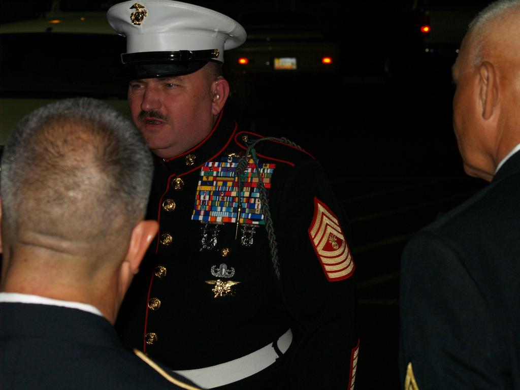 I can’t believe this fat turd actually had the nerve to dishonor a USMC event with his presence. Even a casual observer can tell he’s a phony…he’s wearing a ribbon rack that would make Chesty Puller envious, complete with WWII campaign ribbons. Come on…the youngest living WWII vets are all well into their 80s.
