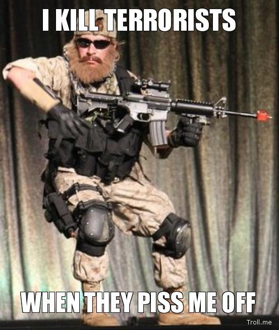 TSO first wrote about Steve “Snake Eyes” Jordan over a year ago. He went to ground for a little bit, but it seems he’s back with even more douche-tooliness. Apparently, a fake beard and a blank firing adapter help him to kill terrorists so well that now he’s a promotable First Sergeant.