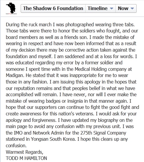 Folks who happened to be on the road march with Hamilton say that he told them that they could never be like him because he was “SF”, so his little excuse about honoring veterans rings hollow a little bit. So, anyway, Hamilton changed his profile on the organization’s website and put up the apology on Facebook.